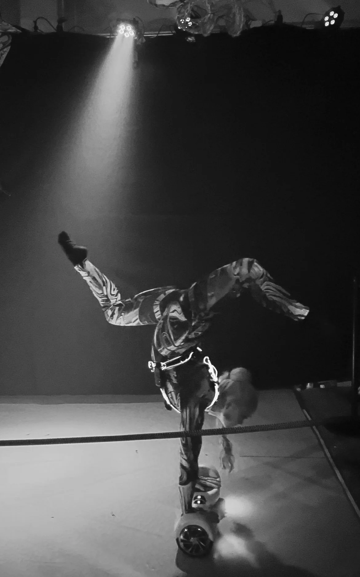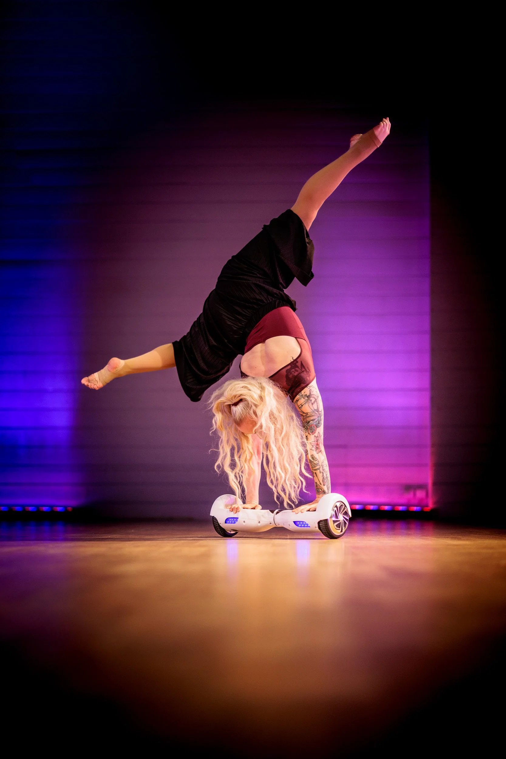 Käsilläseisontaa hoverboardilla ja lattia-akrobatiaa osana 2026: Avaruusseikkailu -poikkitaiteellista tapahtumaa.